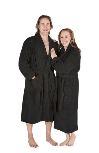 Have you ever been to a luxurious spa or a five star hotel that offered a really thick, really warm terry cotton bath robe? Not a cheap imitation bath robe made from a light weight bath towel fabric, but a truly luxurious, thick cotton robe. THIS is that robe! Truth be told, the quality of this robe is simply unsurpassed in the marketplace today. This unisex shawl collar bathrobe reatures 18 oz loop terry fabric and double belt loops for a custom fit. Two full patch pockets on front panels. Both sides are loop terry making this robe 100 percent water absorbent. In addition, this robe has a sweat catch at back of the neck to absorb extra water from a wet head. Sleeves are cuffed, approximately 3 inches. For our taller customers, it is possible to unroll the cuffs to accomodate longer arms. Inactive dyes (chemical free dyes) were used in the production of this robe.